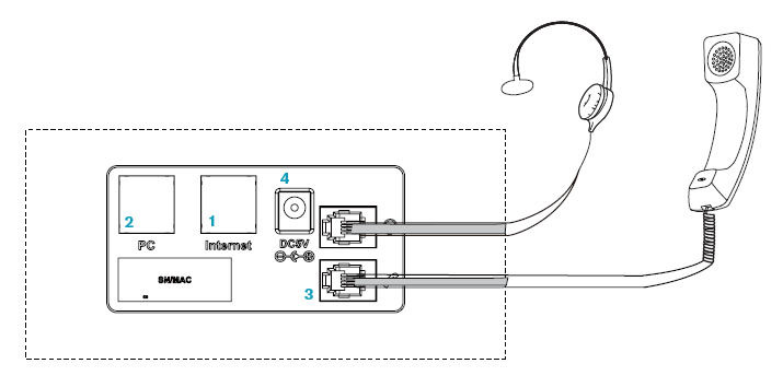 4. Si l’alimentation « Power over Ethernet » n’est pas disponible, connectez le bloc d’alimentation fourni avec le téléphone dans la prise DC5V (4). Branchez l’autre extrémité du bloc d’alimentation sur la prise électrique murale.